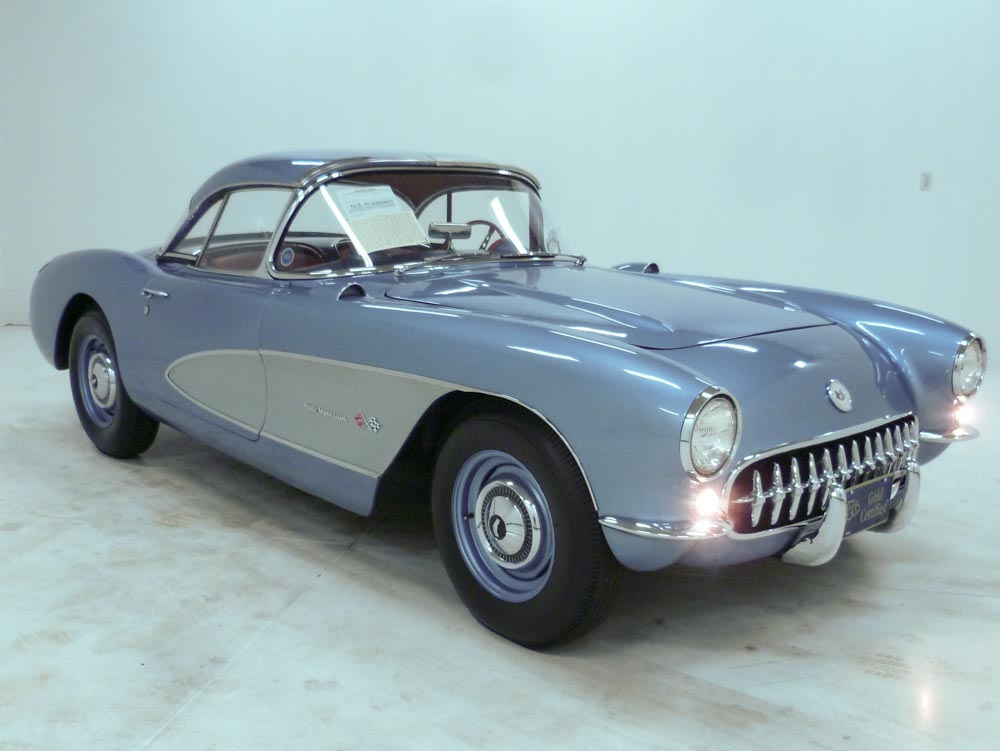1022U..1957 Corvette Triple Crown RPO-684 Hardtop with 283-283 hp fuel injected 3-speed transmission, numbers matching motor. Arctic Blue paint with Inca Silver coves and Venetian Red interior (one of 258 produced in this color combination). Body-off restored in show condition. Bloomington Gold certification, NCRS Top Flight award, Gold Spinner award, Triple Crown award and Triple Crown registry. Impressive owner history including Frank Buck, former board member Hershey AACA Concours d'Elegance who had this car initially restored by Jim Purvis. Other owners included Ray Masciarella, Larry Gerig (re-restored and is known for earning over 200 NCRS Top Flight awards) and Jeffrey Moore of Houston, TX who expertly maintained and cared for this sensational rare car. Radio and heater delete car optioned with very rare RPO-684 heavy duty racing big brakes and suspension package which included metallic brakes, finned brake drums, fresh air ducting to the rear brakes, front brake air scoops (elephant ears), special front and rear springs and shock absorbers, heavier front sway bar and quick steering adaptor. Only 51 were produced and all cars were radio and heater delete!! Other equipment includes auxiliary hardtop, 4.11 posi, off road exhaust, 5-1/2" wheels, dog dish hubcaps, and 6.70-x15" vintage blackwall tires. Most all factory correct type components including the spare, jack, jack tools, trunk mat, trunk liner, rebound straps, spiral shocks, shifter, air cleaner, generator, #905 distributor,gas cap, oil cap, radiator cap, hoses, hose clamps, hood alignment blocks, hood pop-ups, nine finned valve covers, #4360 F.I. unit, F.I. fuel filter, vertical throttle rod and plate, radiator, guide Y-50 mirror, owners manual, sales brochure, and T-3 headlights. Documented with the judging certificates, title copies, owner history, Noland Adams research and 3-ring binder. Looks, runs, and drives excellent. CC:1 Consigned to Mecum Kissimmee Collector Car Auction January 15th - 17th, 2026