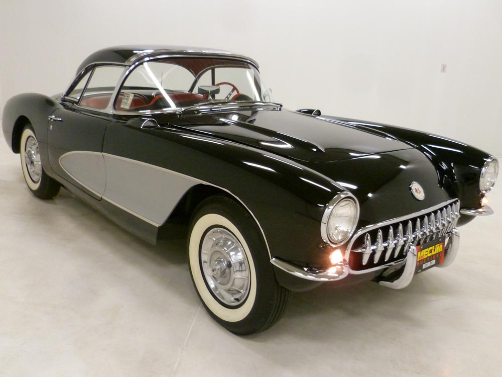 1024U..1957 Corvette Convertible Hardtop, 283-245 hp, (2x4's), 3 speed, numbers matching original motor, transmission and rear end, 21,435 actual miles. Onyx Black paint with Venetian Red interior. Body-on restoration (looks body-off) in show condition. From the past owner of 40 plus years and thought to have been sold new in California. Optioned with auxiliary hardtop, 3.70 rear, Wonderbar radio, dual fours, windshield washers, courtesy lights, heater, hubcaps, and vintage 6.70x15" wide white tires. Most all factory correct type components including the spare, jack, jack tools, trunk mat, trunk liner, rebound straps, washer system, shifter, shielding, air cleaners, generator, distributor, spark plug shields, hoses, hose clamps, hood alignment blocks, 9 fin valve covers, hood pop-ups, fuel filter, dated carbs, #022 master cylinder, dated radiator, grooved rear springs, gas cap, guide Y-50 mirror, owners manual, sales brochure, and T-3 headlights. Documented with the 1985 title, numbers sheet, excellent photo of the engine stamp and 3-ring binder. Looks, runs, and drives excellent. CC:1 Consigned to Mecum Kissimmee Collector Car Auction January 15th - 17th, 2026