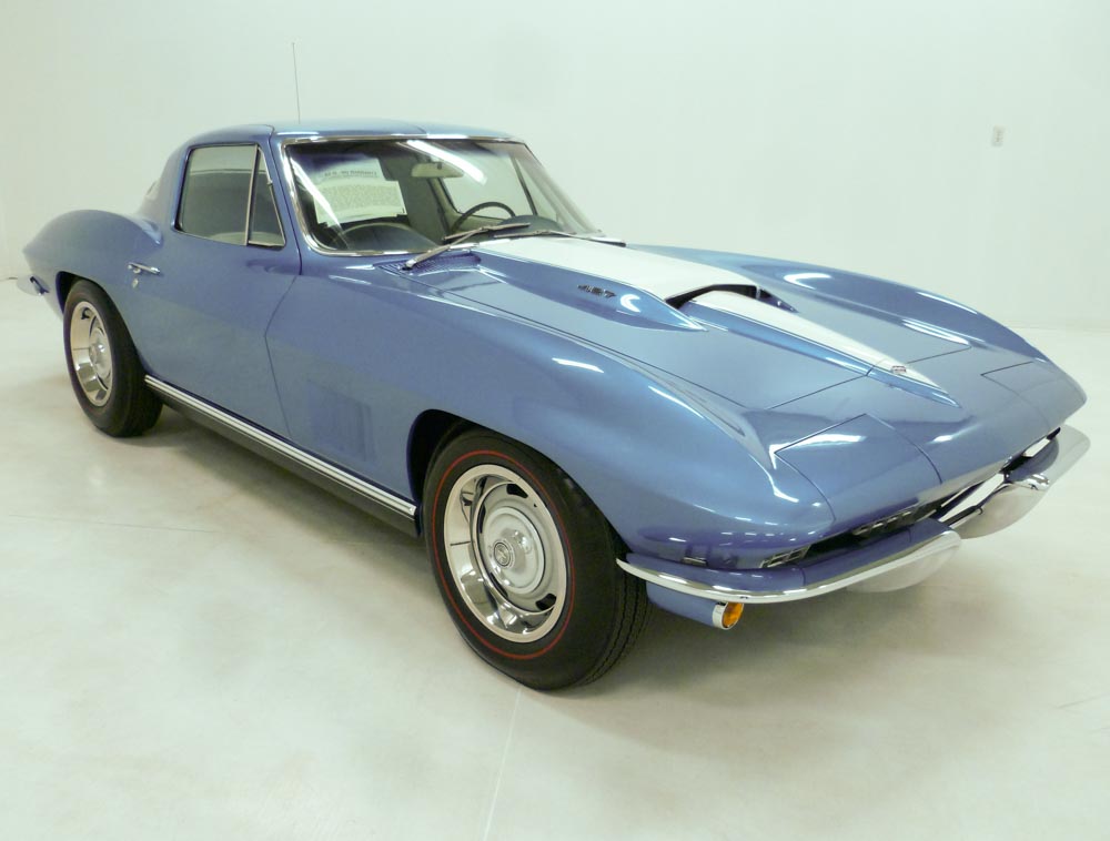 1042Q..1967 Corvette Convertible with two tops, 327-350 hp, 4 speed, numbers matching original motor with CCAS/Grenning Engine Stamp Affirmation, also has factory original body/trim tag, 42,071 actual miles. Lyndale Blue paint with Black interior and White soft top. Original unrestored low-mile car in excellent condition. Bloomington Benchmark, Bloomington Gold certified, Bloomington Gold Survivor, multiple NCRS Top Flights, Bloomington Special Collection 3-times, Gold Concours award and Triple Crown award. Known as the Five Dollar Special! These original unmolested cars are among the rarest of rare and are rising to the top of the Corvette food chain as unrestored cars are used as guideposts for restorers, shining a light on the way vehicles were originally built. The solid feel of an excellent unrestored car cannot be overstated! This car is one of the elite few recipients of America’s most prestigious Corvette awards, the happy result of a lifetime of diligent care and discerning use. Unrestored and original!! It was judged worthy of Bloomington Gold Certification, Survivor and Benchmark honors, the latter being the most important of all to the demanding collector. Benchmark Certification recognizes each recipient as not only unrestored—a quality recognized in Survivor judging—but also that it remains in showroom condition, exactly as it was upon delivery from the factory with the exception of aging. These qualities make it the perfect source of reference for a top-quality restoration of a like car, ergo the term “Benchmark.” Benchmark Certification is only awarded to cars that have achieved both Gold and Survivor on the same weekend, qualify in all four Survivor categories. Benchmark is, by definition, the most important distinction in the entire Corvette judging regime, one awarded to fewer than 230 Corvettes 1953 to 1972 and less than 70 were 1967s as of this writing—including this jewel. The expenses involved in obtaining these awards could surely exceed $20,000.00. The engine, transmission and rear end are original to this car. Optioned with factory side exhaust (which was added and we have the original undercar exhaust and the rear valance), telescopic, auxiliary hardtop, M-21, 3.70 posi, SS brakes, AM/FM radio tinted windshield, rallys, redline tires, and custom fit car cover. Most all factory correct type including the spare, jack, jack tools, clear floor mats, Delco shocks, seat belts, washer system, shifter, shielding, air cleaner, alternator, distributor, spark plug shields, hoses, hose clamps, carb, window glass, valve covers, starter, ball joints, expansion tank, radiator, gas door assembly, bowtie mirror, glove box door, warranty book, owners manual, sales brochure, and T-3 headlights. Documented with the dealer invoice, tank sticker, warranty book/P.O.P., owner history, show history, old titles, photo album, certificates/awards, judging sheets, ribbons, and no less than five 3-ring binders. Also has an affirmation by CCAS/Grenning as to the legitimacy and originality of the engine block, stamp pad, and the engine stamp. Editorialized multiple times as the Five Dollar Special!! Looks, runs, and drives excellent as the optional 350 hp engine proved to be one of the most civilized engines produced in 1965 to 1967. $149,000.00