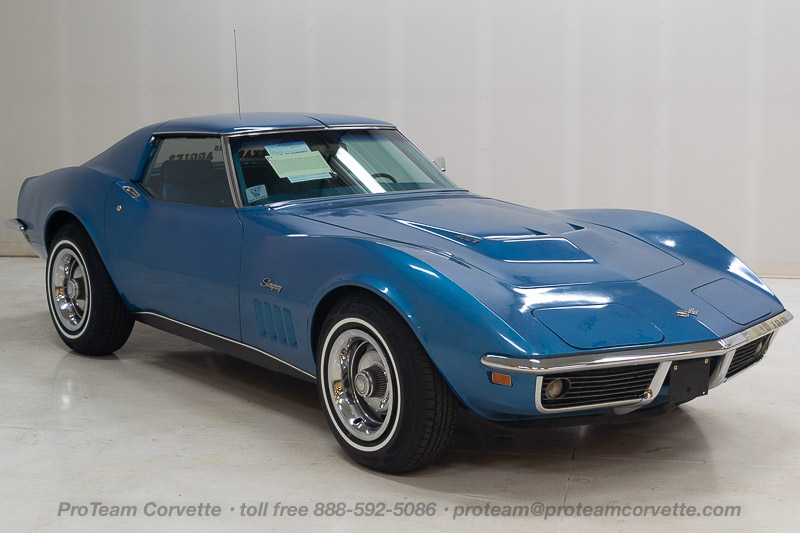 1029K..1969 Corvette Coupe with removable T-Tops, 427-435 hp, 4 speed, numbers matching original motor two-owner car with 53,000 actual miles. Lemans Blue paint with Bright Blue interior. Original unrestored survivor including paint, interior, engine, transmission, and rear end. Also has an affirmation by CCAS/Grenning as to the legitimacy and originality of the engine block, stamp pad, and the engine stamp. Early production car that is almost 50-years old and shows itself well. These original unmolested cars are among the rarest of rare and are rising to the top of the Corvette food chain as unrestored cars are used as guideposts for restorers, shining a light on the way vehicles were originally built. The solid feel of an excellent unrestored car cannot be overstated! Optioned with headrests, transistorized ignition, M-21, 3.70 posi, F-41 special heavy duty suspension, SS brakes, AM/FM stereo radio, off road exhaust, tinted glass, rally wheels, and white stripe tires. Most all factory correct type components including the spare, jack, jack tools, clear floor mats, T-Top bags, shocks, seat belts, washer system, shifter, shielding, braided wires, air cleaner, alternator, distributor, valve covers, expansion tank, radiator, gas door assembly, warranty book, owners manual, and sales brochure. Documented with extensive documentation including the protect-o-plate, dealer invoice, Corvette owners card, canceled original purchase check, CCAS/Grenning Engine Stamp Affirmation, and owners manual. Production date of October 4th, 1968 and delivered new by Daniels Motors in Colorado Springs, CO (dealer code 207 in zone 10) per the official NCRS/GM Shipping Data Records (SDR). This was a one-owner car until 2017!!! Looks, runs, and drives exceptional for a 50-year old car! CC:+2 $110,000.00