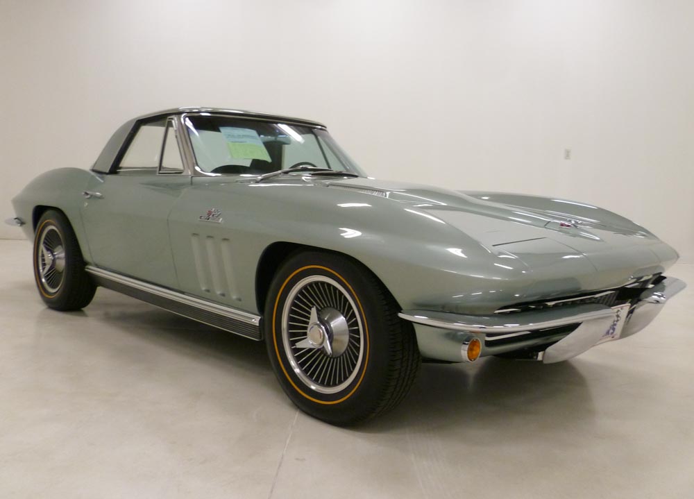 1009W..1966 Corvette Convertible with Two Tops, 427-425 hp, 4 speed, numbers matching original motor, transmission and rear end, also has factory original body/trim tag, 52,021 actual miles. Mosport Green paint with Dark Green interior and Black soft top. Body-on but looks body-off restored low-mile car with original interior, seats, carpet, door panels, dash, factory OEM body panels and NCRS Top Flight award. Also has an affirmation by CCAS/Grenning as to the legitimacy and originality of the engine block, stamp pad, and the engine stamp. Optioned with power antenna, teakwood wheel, transistorized ignition, auxiliary hardtop, M-21, 4.11 posi, SS brakes, AM/FM radio, back-up lights, off road exhaust, tinted windshield, Kelsey K.O. aluminum wheels and gold stripe radials. Most all factory correct type components including the spare, jack, jack tools, floor mats, shocks, seat belts, washer system, shifter, shielding, braided wires, air cleaner, alternator, distributor, spark plug shields, hoses, hose clamps, window glass, valve covers, #207 coil, #3247 carb, exhaust heat shields, Kelsey K.O. aluminum wheels, gas door assembly, Bowtie mirror, glove box door, warranty book, owners manual, sales brochure, and T-3 headlights. Documented with the CCAS/Grenning affirmed warranty book/P.O.P., CCAS/Grenning Engine Stamp Affirmation, NCRS confirmation of judging awards, owner history, inspection/appraisals from 1992, 2000 and 2005, restoration photos, restoration receipts and two documentation binders. From the past owner of 34-years (1992). Production date of May 3rd, 1966 and delivered new by Norton Chevrolet in Philadelphia, PA (dealer 460 in zone 15) per the official NCRS/GM Shipping Data Records (SDR). Looks, runs, and drives excellent. CC:+2 $169,000.00