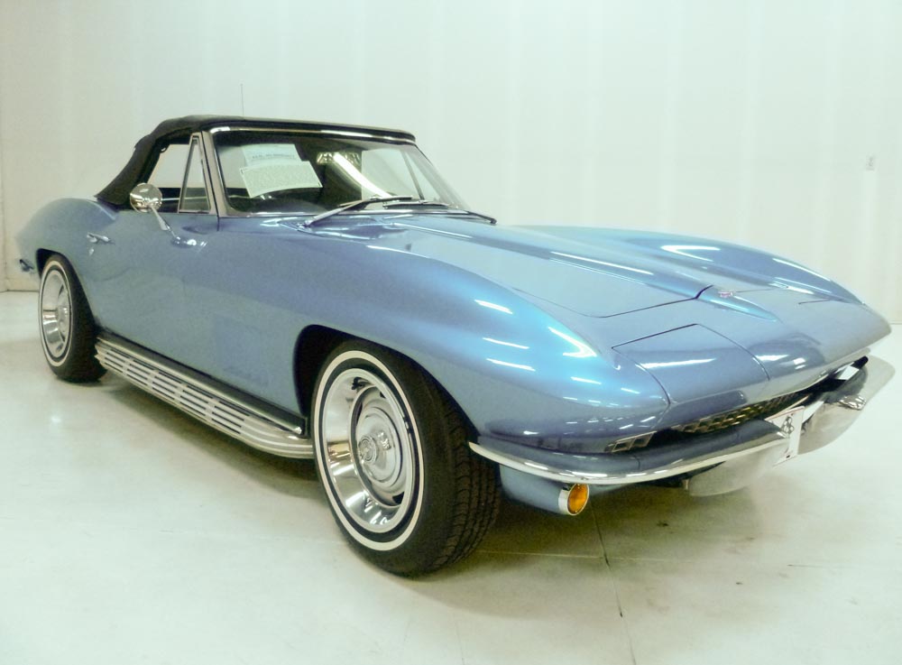 1025U..1967 Corvette Convertible with Two Tops, 427-400 hp, 4 speed, numbers matching original motor and transmission, also has factory original body/trim tag with CCAS/Grenning Trim Tag Affirmation, 2 or 3 owner car with 62,943 actual miles. Silver Pearl paint with Teal Blue stinger, Teal Blue interior and Teal Blue soft top. Body-off restored in show condition. Also has an affirmation by CCAS/Grenning as to the legitimacy and originality of the engine block, stamp pad, and the engine stamp. These type restorations normally cost between $125,000.00 to $150,000.00. This restored Corvette has yet to be shown, creating an exciting opportunity for the next owner to exhibit the car and compete for trophies, awards, and recognition! Optioned with power windows, leather, headrest seats, auxiliary hardtop, M-21, 3.36 posi, SS brakes, AM/FM radio, tri-power, tinted glass, B.O. aluminum wheels and vintage 7.75x15" red stripe tires. Most all factory correct type components including the spare, jack, clear floor mats, seat belts, washer system, shifter, shielding, braided wires, air cleaner, alternator, hoses, hose clamps, starter, gas door assembly, glove box door, warranty book, owners manual, sales brochure, and T-3 headlights. Documented with warranty book/P.O.P., CCAS/Grenning Engine Stamp Affirmation. CCAS/Grenning Trim Tag Affirmation, owners manual packet, owner history, previous owner's title, numbers sheet and 3-ring binder. Only 2,101 427-400 hp were produced in 1967. From the past owner of 19 years. Production date of September 21, 1966 and delivered new by Huebsch Chevrolet in Prairie Du Chien, WI (dealer code 292 in zone 61) per the official NCRS/GM Shipping Data Records (SDR). Looks, runs, and drives excellent. CC:1 Corvette consigned to Mecum Indy Classic Car Auction | May 8th – 16th, 2026